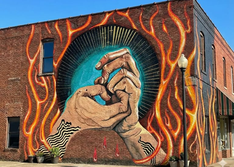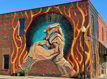 Turn walls into narrative spaces, mixing tattoo inspired outlines, poison bright color, and cave painting energy to tell stories rooted in Detroit and the people who move through it.